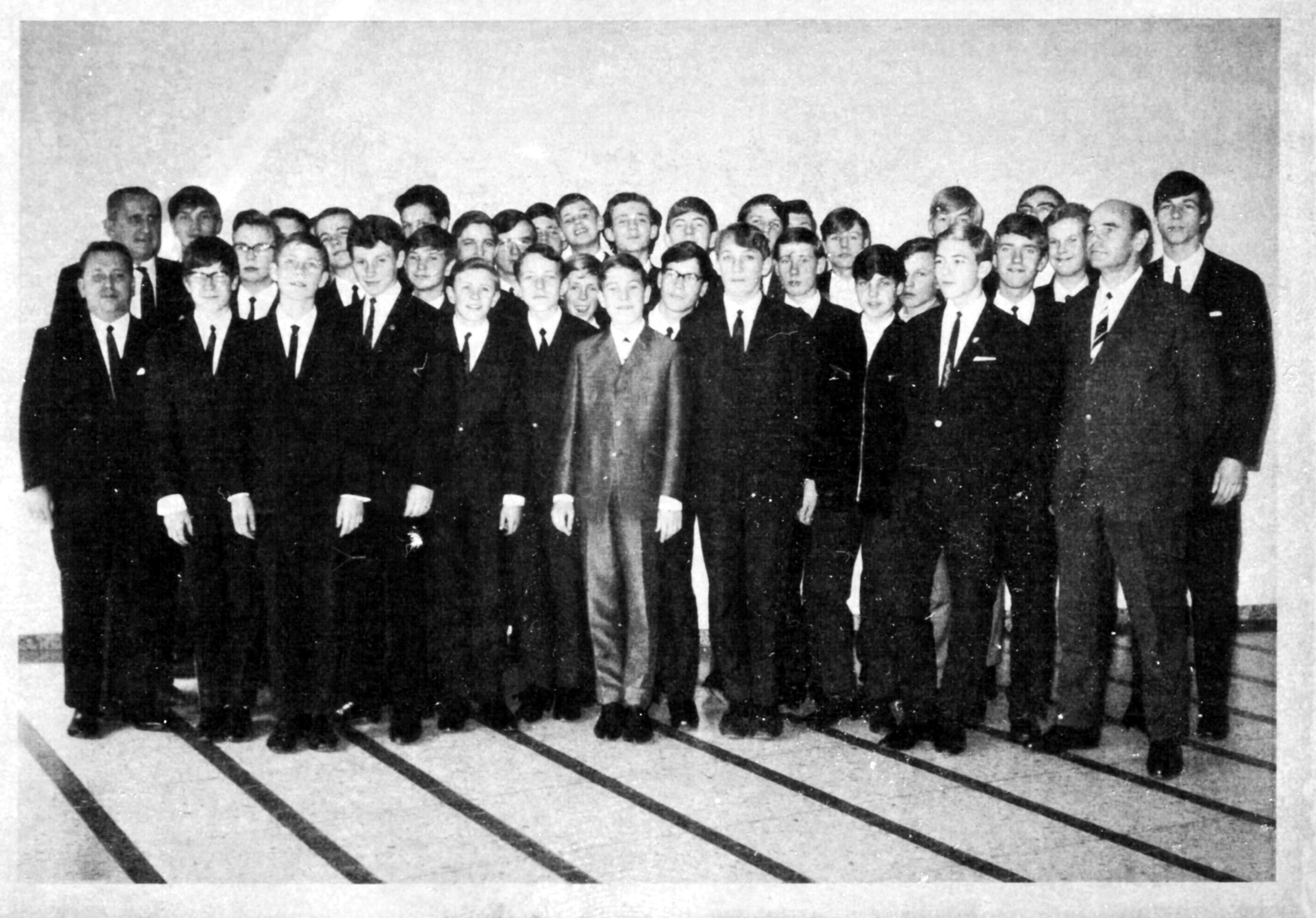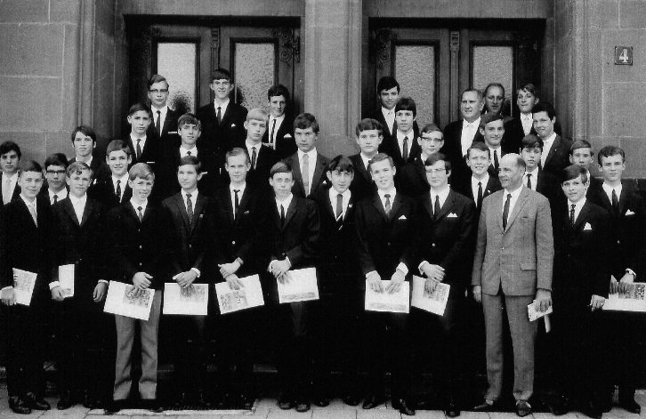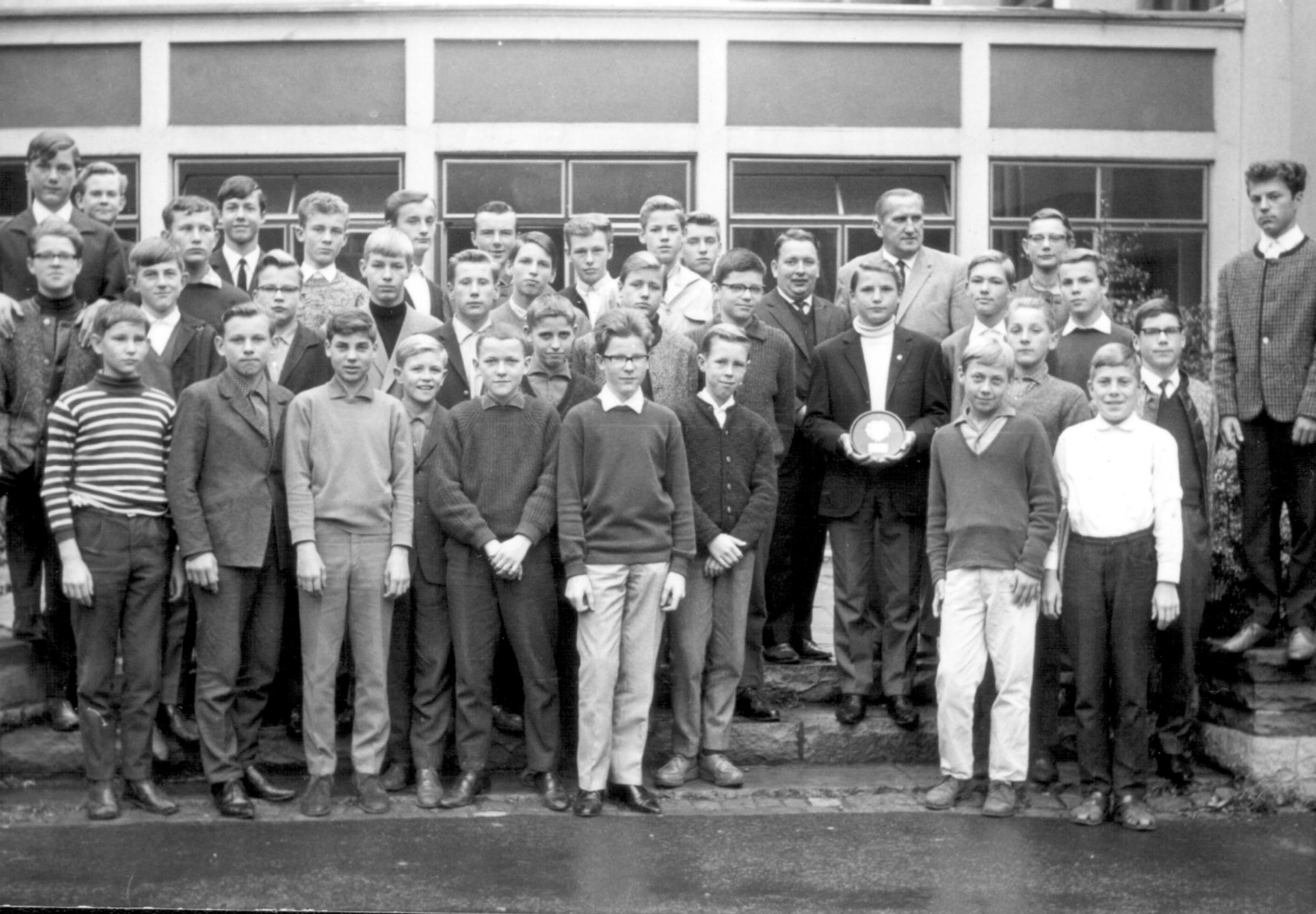 Gruppenbild mit Abschlußzeugnis vor dem Haupteingang und in der Eingangshalle Turnhalle am 12. Juli 1967