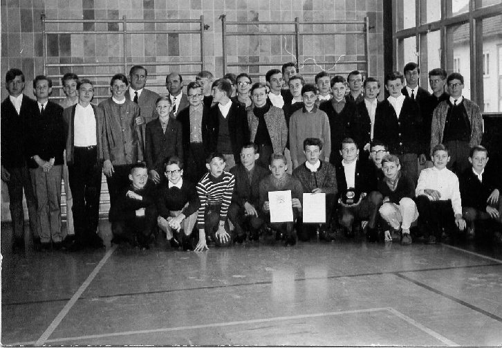 Gruppenfoto in der Turnhalle und vor der Turnhalle zur Urkundenverleihung 1966